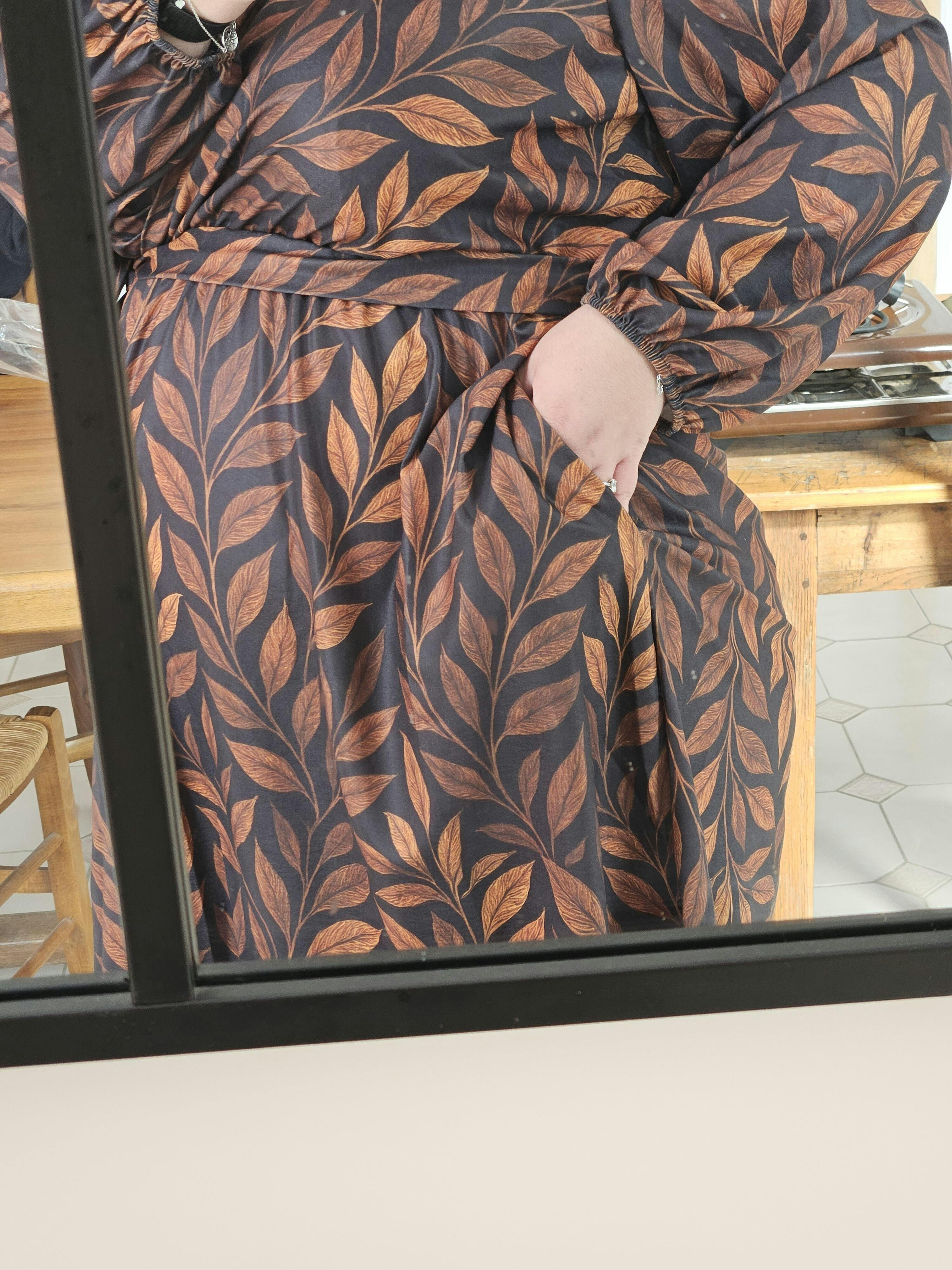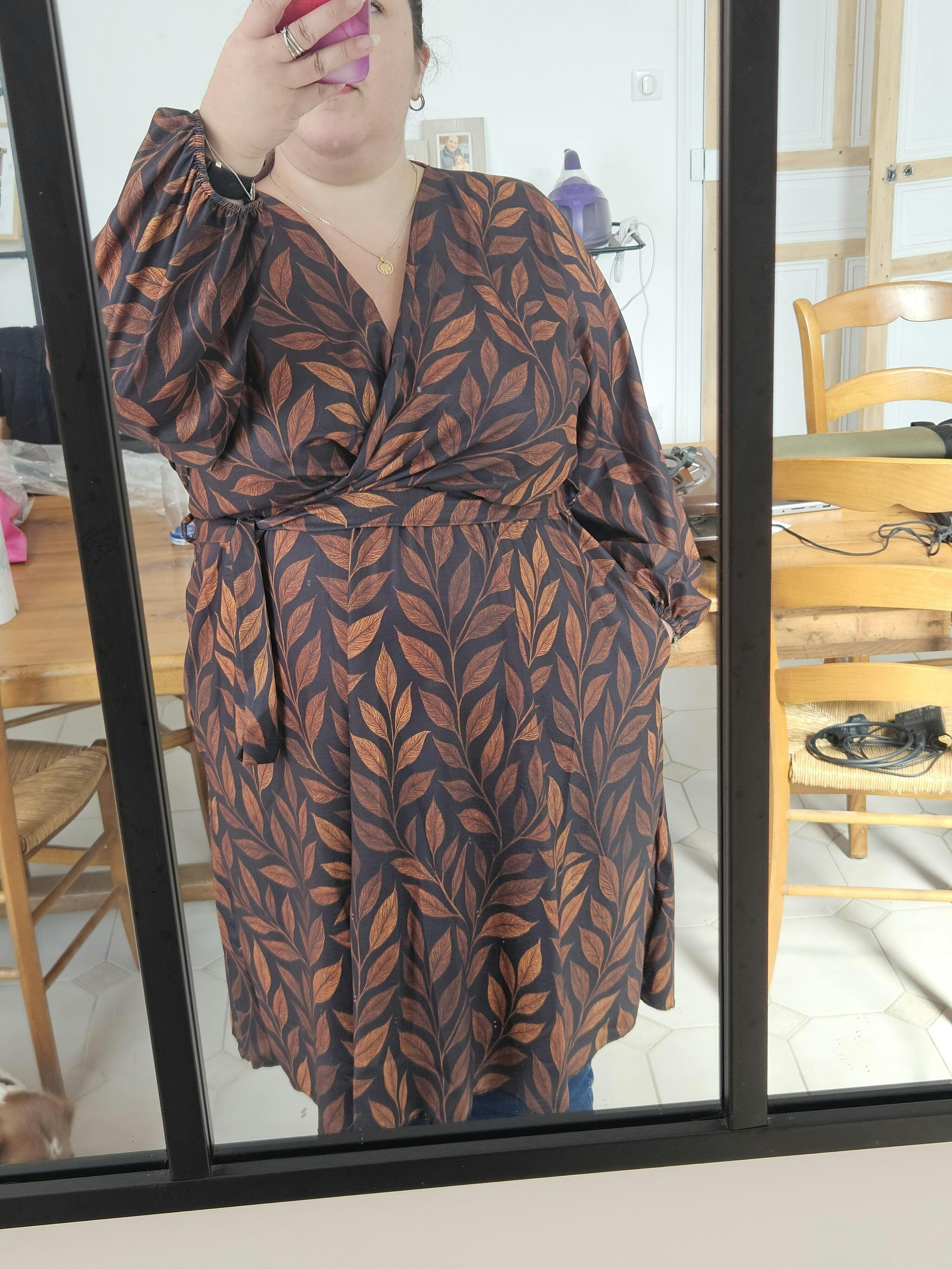Le décolleté cache coeur est bien fermé j'avais peur que ça baille avec ma poitrine mais c'est juste nickel. La robe et les imprimés sont très jolis, je fais 1m68 donc ça m'arrive bien au genou, les poches apporte un gros plus pratique c'est génial